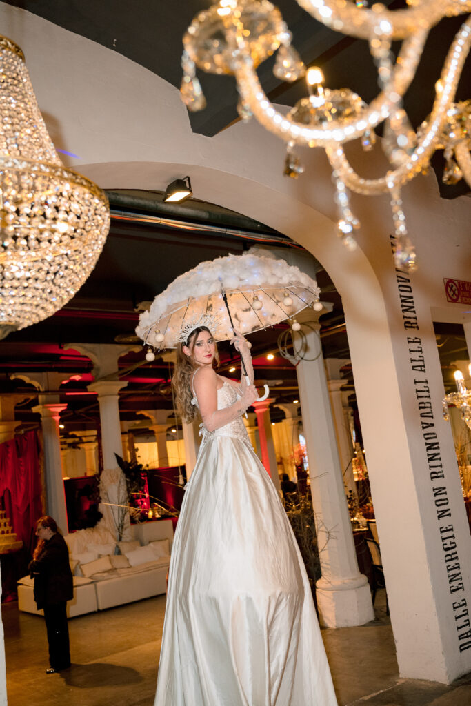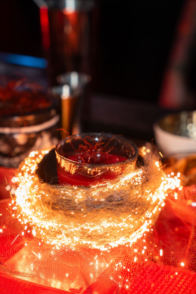 L’evento si è aperto con una welcome experience in cui gli ospiti sono stati accolti da una proposta scenografica suddivisa nei tre regni: drink analcolici serviti da trampolieri per il Paradiso, performer con gonne scenografiche e cocktail in sfere per l’Inferno, e un Purgatorio con finger food e caviale alcolico serviti anche in live show.