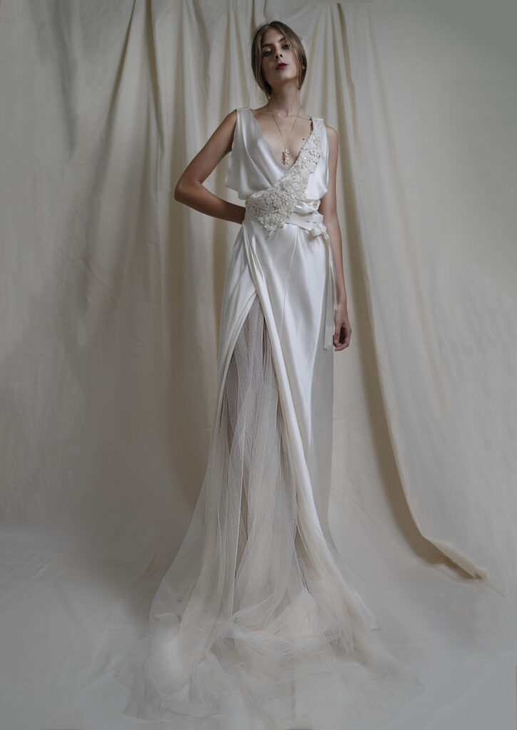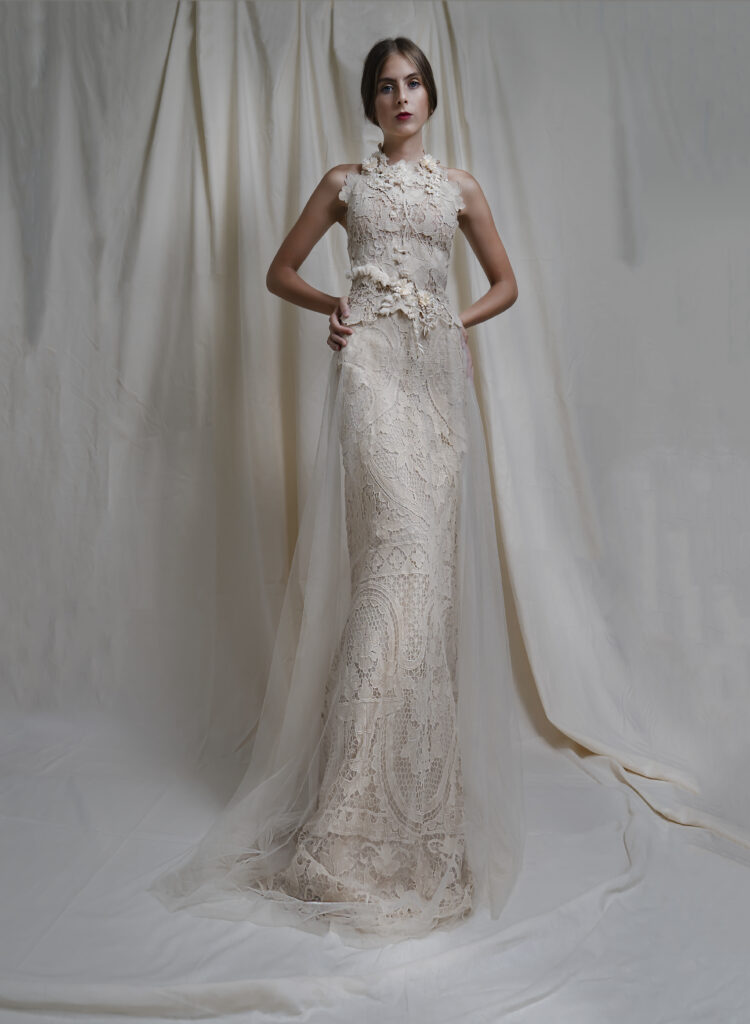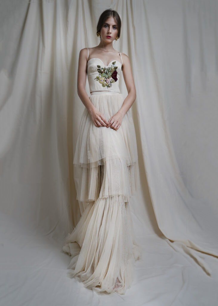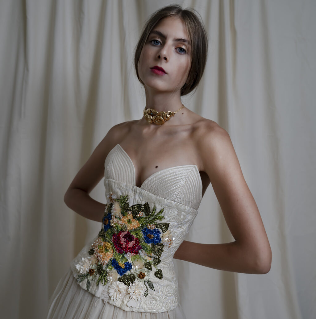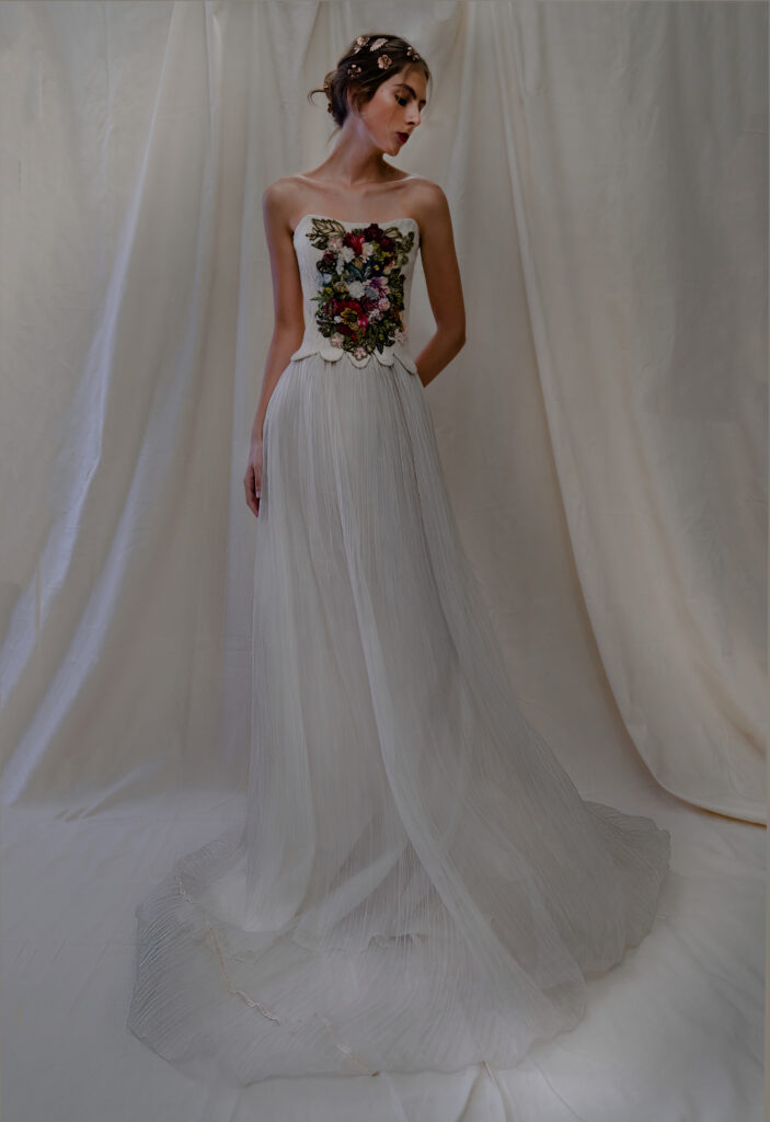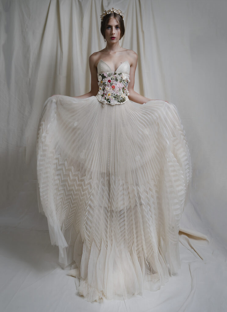 “Abiti che paiono quadri: bustier che vanno a coprirsi di fiori dipinti a mano, di piccole pieghe; drappi e plissettature fiorite di dettagli infinitesimali che diventano essenziali; sovrapposizioni di stoffe, plissé e veli in tulle in tutte le nuance dell’avorio.”